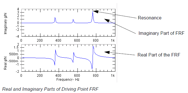 A driving point measurement is a measurement where the input degree of freedom (DOF) is the same as the output DOF. The imaginary part of a driving point FRF should be completely positive or completely negative, depending on the positive or negative orientation of the input and output signals. The peaks or dips of the imaginary part of a driving point FRF correspond to the system resonances.