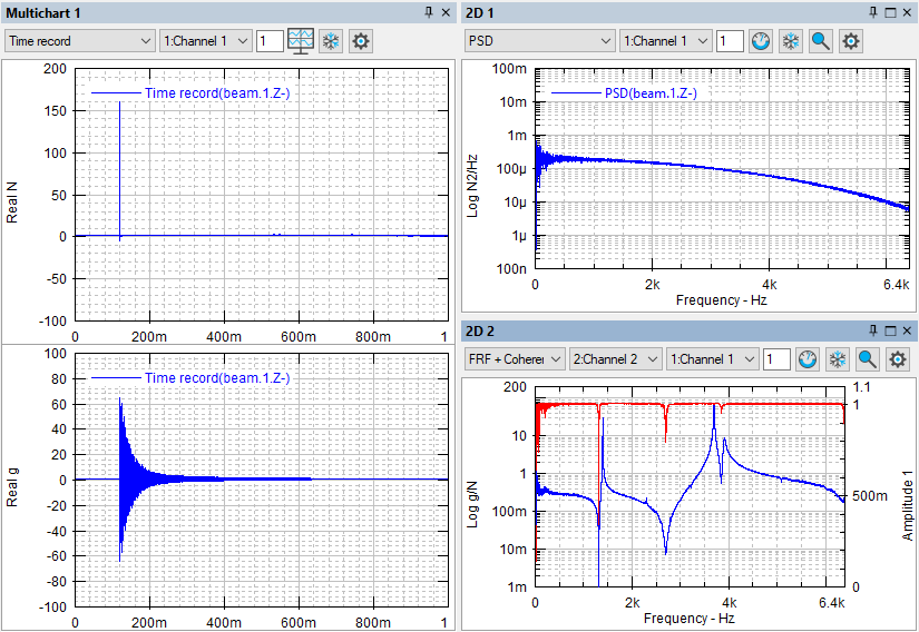이상적으로는 관심 주파수 범위에서 coherence(일관성)이 1이어야 합니다. 낮은 coherence(일관성) 값은 반드시 FRF의 잘못된 추정을 의미하지는 않지만 FRF의 좋은 추정을 얻기 위해 더 많은 수의 평균이 필요함을 나타낼 수 있습니다.
