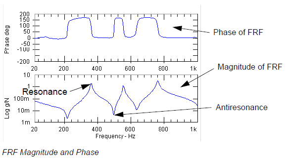 FRF는 시스템 특성의 함수이며 입력 유형과 무관합니다. FRF를 계산할 때 선형성, 시간 불변성, 관측 가능성 및 상호성을 가정합니다. FRF 크기는 시스템 공진에서 피크를 가지며 시스템 반공진에서 딥을 갖습니다. FRF 위상은 공진을 통해 180도 떨어지고 반공진을 통해 180도 상승합니다.