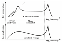 정전류 구동식 셰이커의 주파수 응답 곡선은 세 부분으로 나눌 수 있습니다. 첫 번째와 두 번째 부분은 이동 요소와 그 현가 장치의 스프링-질량 시스템을 나타내며, 자체 공진 주파수는 20Hz입니다. 세 번째 부분에서는 이동 요소의 축 방향 공진이 발생하여 셰이커의 최대 주파수 한계를 결정합니다. 대형 셰이커의 경우 이 한계는 일반적으로 3kHz 이상입니다.