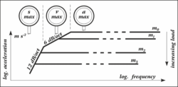 그림 2는 이중 대수(로그-로그) 스케일로 나타낸 가속도를 주파수의 함수로 보여줍니다. 변위 한계는 12dB/옥타브의 기울기를 갖는 직선으로 표현됩니다. 대형 진동 시험기에서는 스프링의 예열 및 전력 증폭기의 최대 출력 전압에 따라 진동 속도 한계가 종종 발생합니다. 이 진동 속도 한계는 6dB/옥타브의 기울기를 갖는 직선으로 표현됩니다. 상한 주파수는 이동 요소의 자체 공진 주파수에 따라 달라집니다.