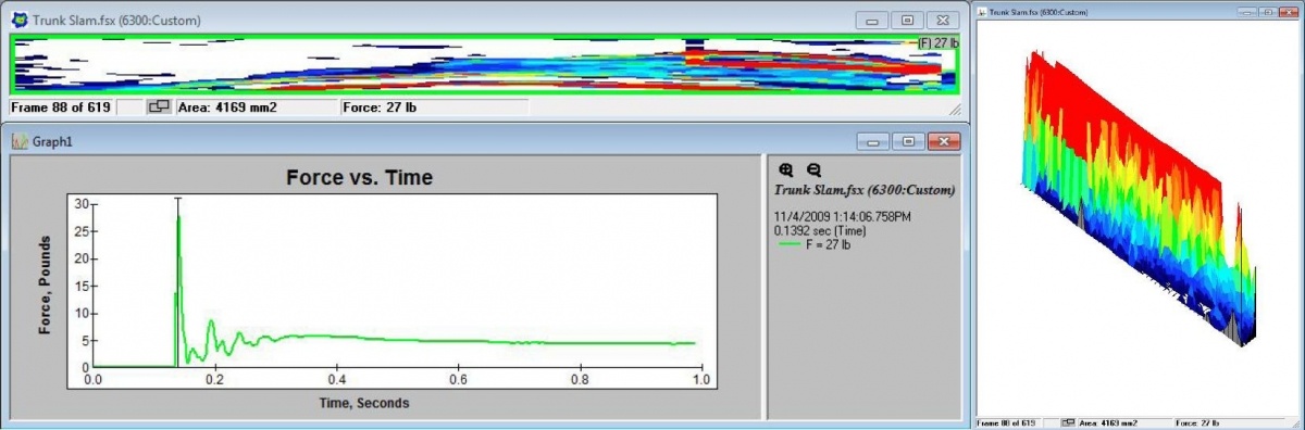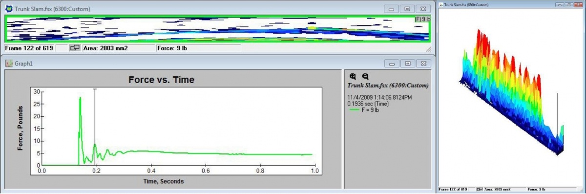 아래 그림은 자동차 트렁크 뚜껑이 씰과 종이처럼 얇은(0.1mm) 감지 센서가 덮을 때 I-Scan™ 압력 매핑 시스템이 수집한 데이터의 일부를 보여줍니다. 힘 대 시간 그래프 기능은 트렁크 뚜껑의 운동량이 씰을 과도하게 압축할 때 초기 힘이 얼마나 큰지를 보여줍니다. 이 힘은 안정화되기 전에 여러 번 진동합니다. 녹화된 파일의 프레임을 살펴보면 이 과정에서 밀봉력과 압력 분포가 어떻게 변하는지 알 수 있습니다. 녹화된 각 프레임 사이의 시간은 0.001초입니다.