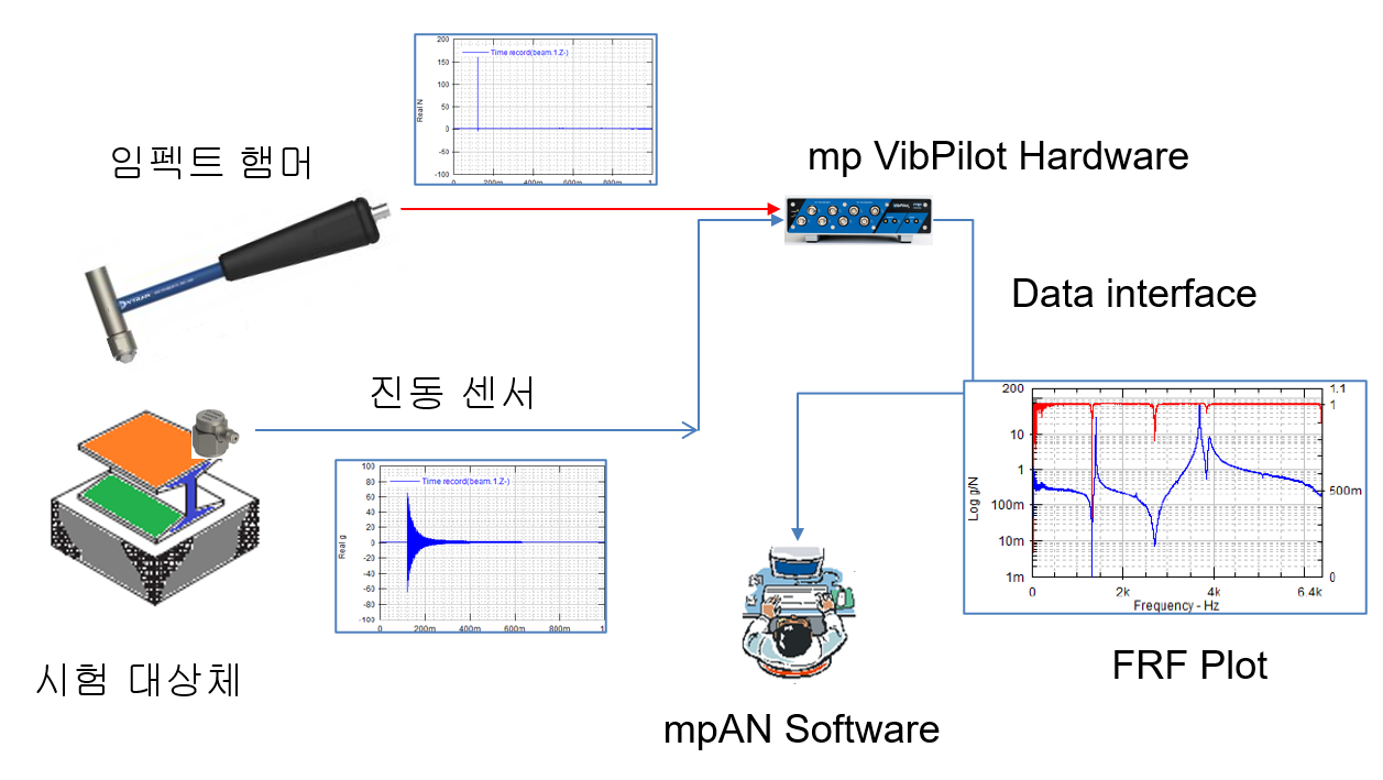 테스트 대상(시편)을 자극하는 일반적인 방법 중 하나는 가진기를 사용하는 것입니다. 가진기에 부착된 동적 힘 센서는 입력된 포스 진폭을 정의하는데 사용되며 신호 발생기(함수 발생기)는 주파수를 제어합니다. 테스트 대상이 너무 커서 물리적으로 불가능 할 때에는 임펙트 해머로 시험 대상물에 가진을 하는 방법입니다. 해머 헤드에 장착된 동적 힘 센서는 입력된 동적 힘 신호를 진폭 및 위상 정보를 포함하는 유사한 파형으로 변환합니다.