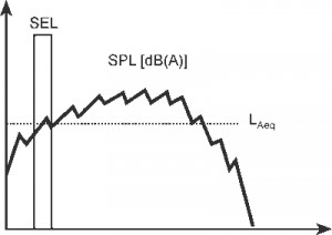 그림은 SEL, SPL, Leq 간의 관계를 보여줍니다. Leq는 실제 변화하는 소리(SPL)와 동일한 양의 에너지를 생성하는 데 필요한 상수 수준입니다.