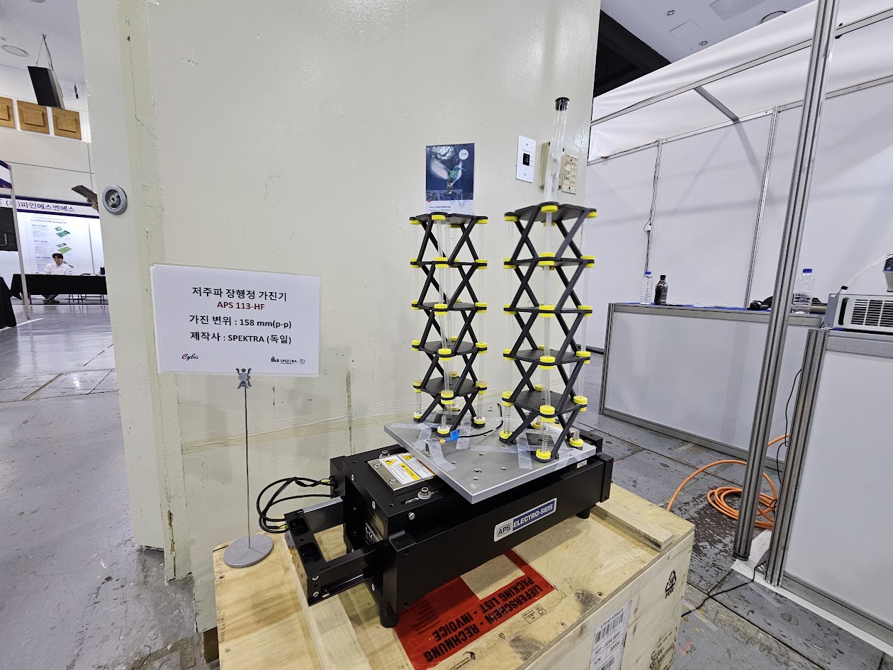 특징 : Linear ball Bearing 가이드 방식, 저주파 가진기, 장행정 가진기 , DC ~ 200 Hz 가진주파수 범위 158 mm pk-pk 변위, 133 N (186 N) 가진력, 가진기 무게 약 36 kg
