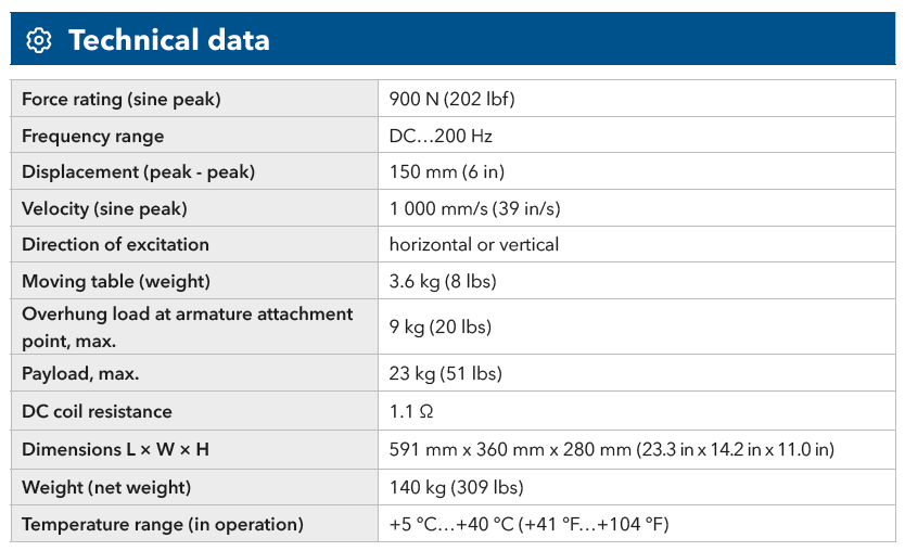 특징 : Linear ball Bearing 가이드 방식, 저주파 가진기, 장행정가진기 , DC ~ 200 Hz 가진주파수 범위 150 mm pk-pk 변위