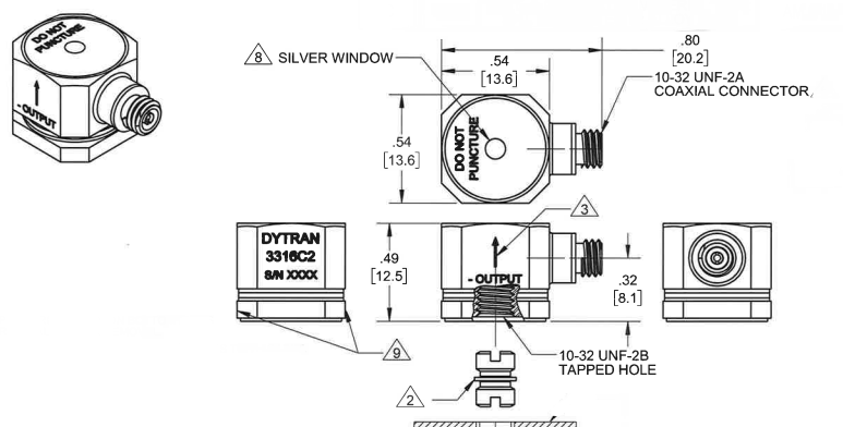 Dytran by HBK 3316C2는 가볍고 소형 디자인으로 다른 유형의 가속도계로는 접근할 수 없는 위치에서 사용하기에 이상적입니다. 0.5~2 pC/g의 감도와 최대 10,000Hz의 상위 주파수 응답을 제공하는 3316C2는 10-32 탭 구멍과 10-32 방사형 커넥터를 갖추고 있습니다. (정확한 감도는 각 센서와 함께 제공되는 교정 인증서에 나와 있습니다.)