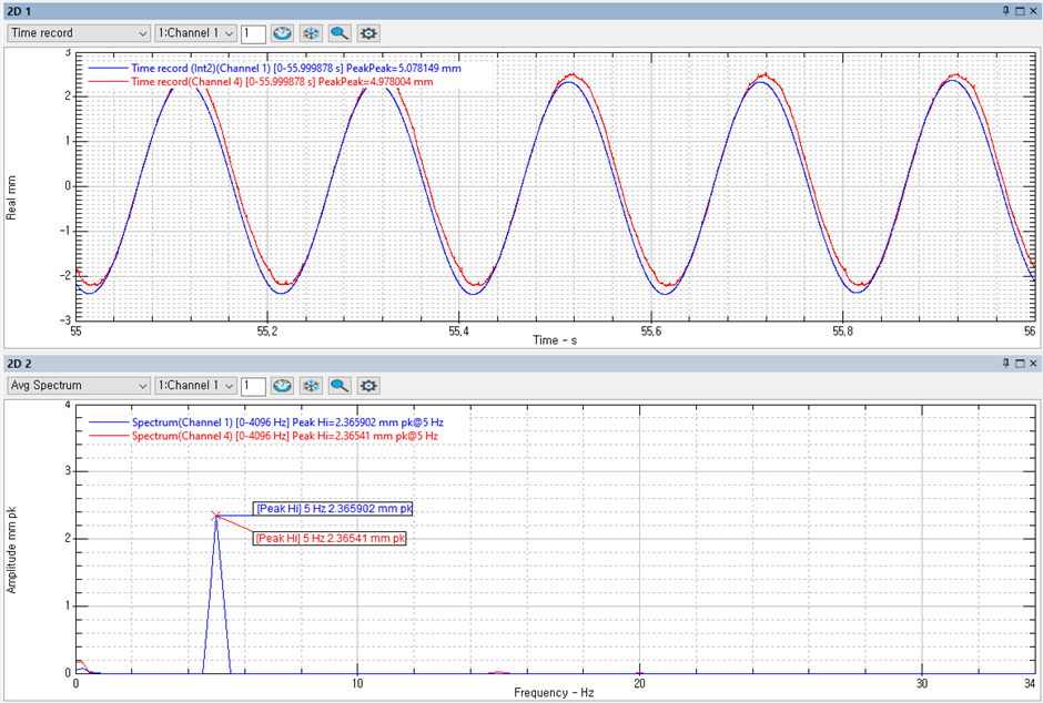 2. 동시에 계측한 2 센서의 Time Data 및 Spectrum 데이터 비교