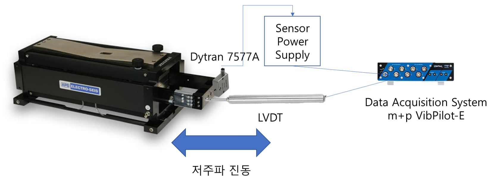 독일 SPEKTRA사의 APS 113 가진기와 mpAnalyzer 분석장비를 사용하여 접촉식 변위 센서인 LVDT와 Dytran 사의 DC MEMS 가속도 센서인 7577A2를 이용하여 저주파에서의 변위 비교를 하였습니다.