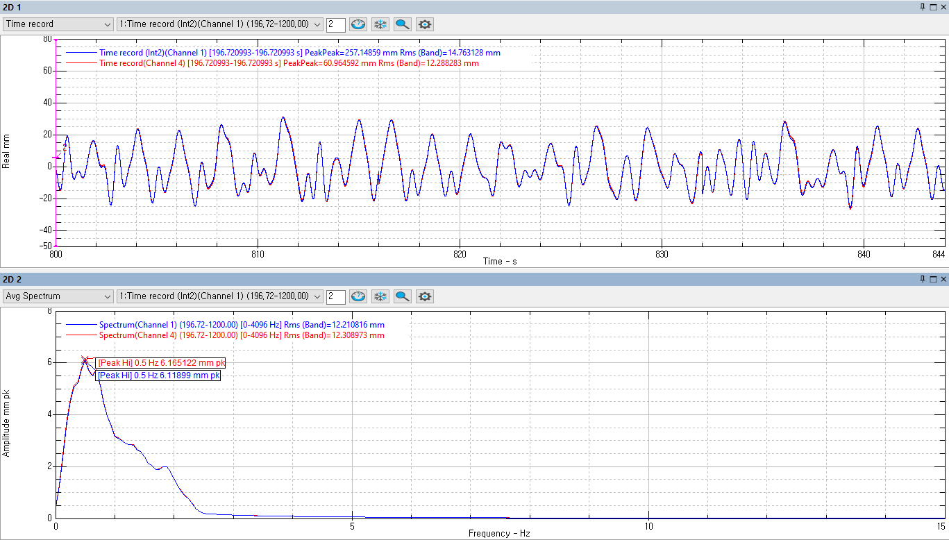일반적으로 저주파수 변위 측정을 위해서는 LVDT 혹은 Laser 변위센서와 같은 변위센서를 이용한 측정이 대부분 이였습니다. 가속도센서를 이용하여 변위 분석을 할 때에는 센서의 Noise, Dynamic range 및 일반적인 IEPE(ICP)센서의 경우 저주파 측정 자체가 안되는 경우가 있어 1~3Hz이상 주파수에서만 변위 분석을 진행하였으나, Dytran의 7577A2 DC MEMS센서와 m+p Analzyer를 이용하여 초 저주파에서도 직접 접촉하는 LVDT센서와 다름없이 변위 분석이 가능함을 확인하였습니다.